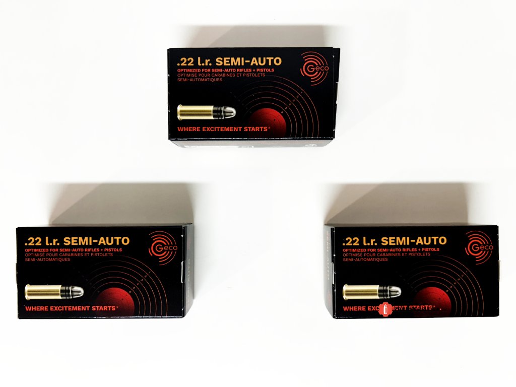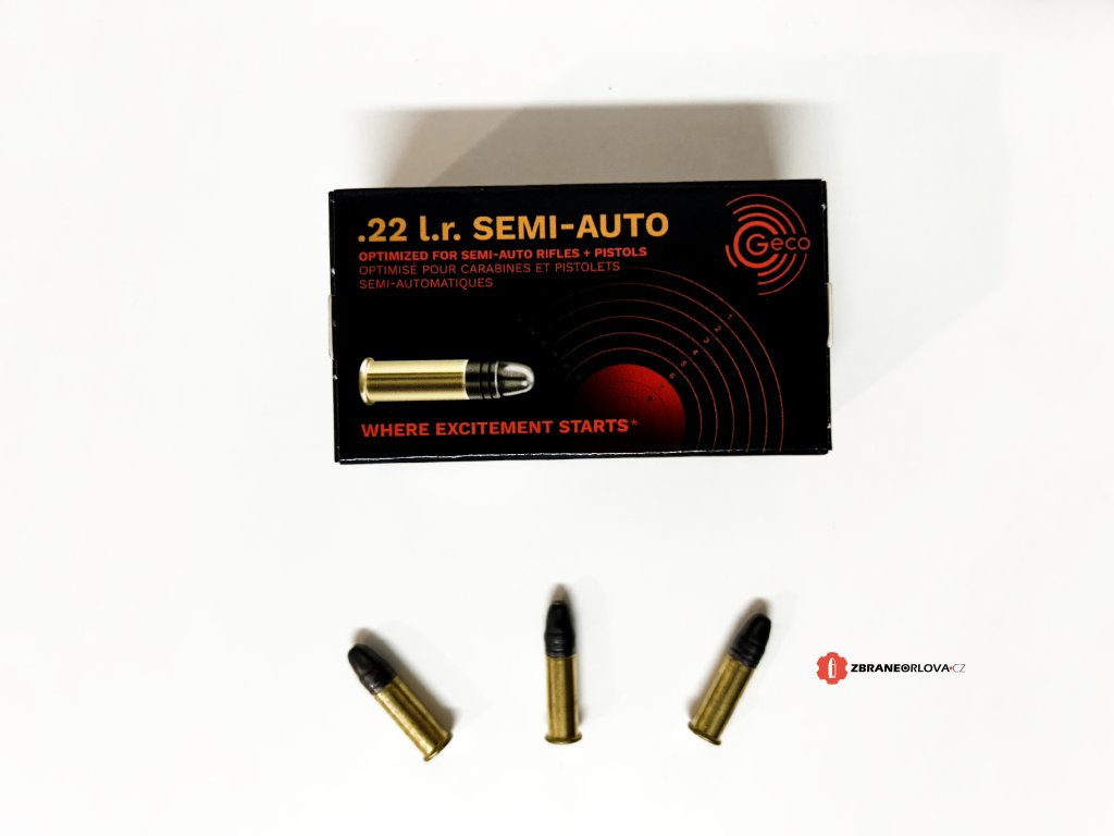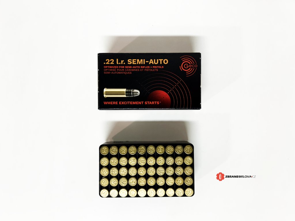 Střelivo německé značky GECO v provedení Semi-Auto, které je vhodné především pro sportovní střelbu. Střela typu LRN o hmotnosti 2,6 g (40 gr). Cena za kus je 2,3 Kč, baleno po 50 kusech.