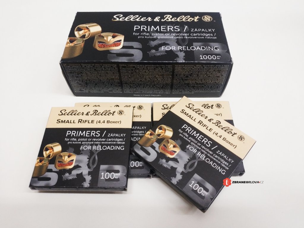 Zápalky 4,4 SR (Small Rifle) od domácího výrobce Sellier & Bellot. Cena za kus je 1,27 Kč, baleno po 1000 kusech.