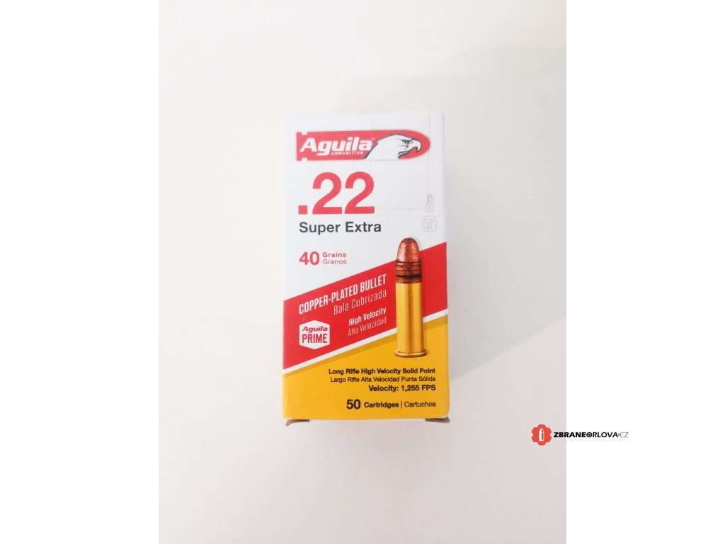 Malorážkové střelivo z mexické muničky Aguila .22 LR Super Extra HV, jsou náboje s okrajovým zápalem v provedení High Velocity. Náboje jsou vhodné zejména pro lov drobné škodné zvěře a sportovní střelbu. Střelivo se vyznačuje lepší výkonností nežli Sellier & Bellot a to za stejnou cenu. Cena za kus je 1,8 Kč, baleno po 50 kusech.