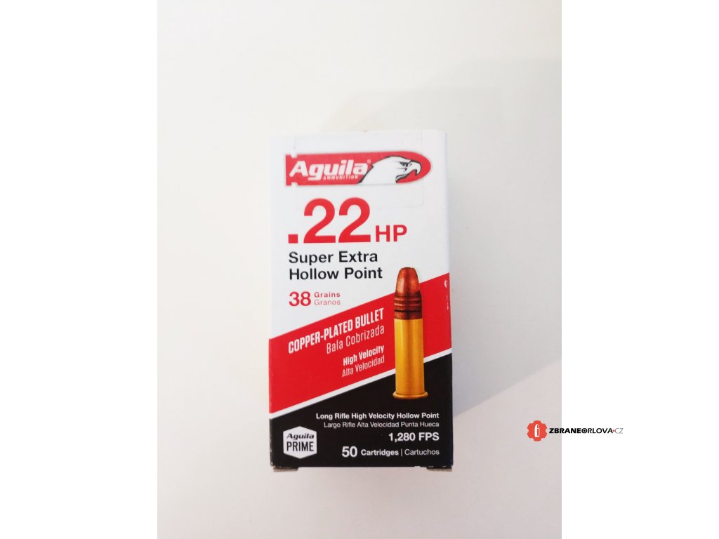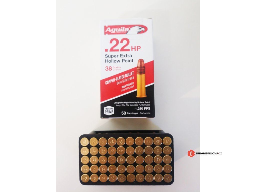 Malorážkové střelivo z mexické muničky Aguila .22 LR Super Extra HV HP, jsou náboje s okrajovým zápalem v provedení High Velocity, střela Hollow Point. Náboje jsou vhodné zejména pro lov drobné škodné zvěře a sportovní střelbu. Střelivo se vyznačuje lepší výkonností nežli Sellier & Bellot a to za stejnou cenu. Cena za kus je 1,8 Kč, baleno po 50 kusech.