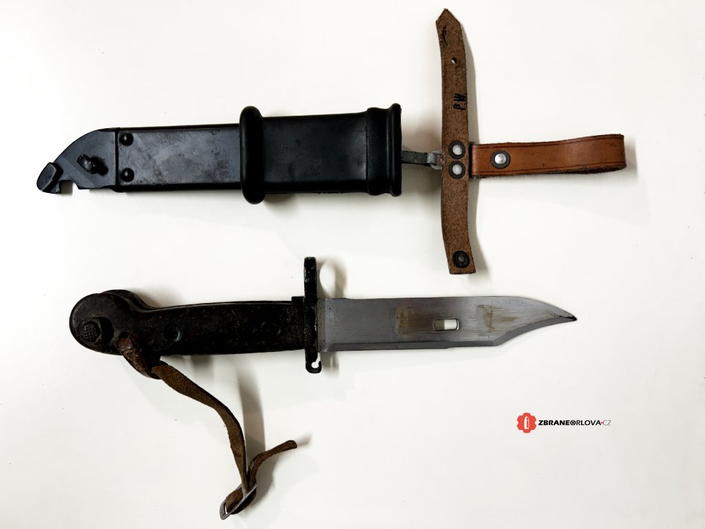 První model (6N3) bodáku pušky AKM polské výroby, kompletní se závěsníkem a pochvou. Bodáky jsou použitelné u zbraní: AKM, M70, AK74, SVD63, M21, BERYL, AKMS apod.