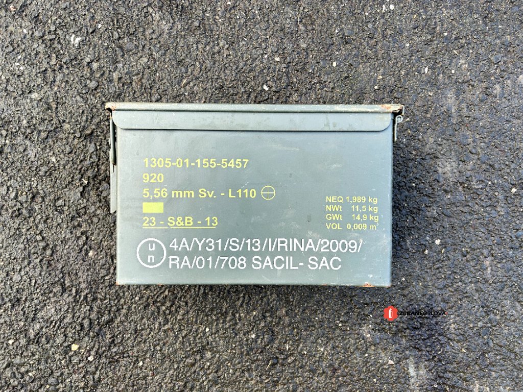 Použité, hermetické muniční schránky na střelivo (a další citlivý materiál) typu M2A1. Schránky mají UN/IATA certifikaci na přepravu nebezpečného obsahu. Uvnitř jsou jako nové, zevnější strana může nést stopy po používání (skladování).